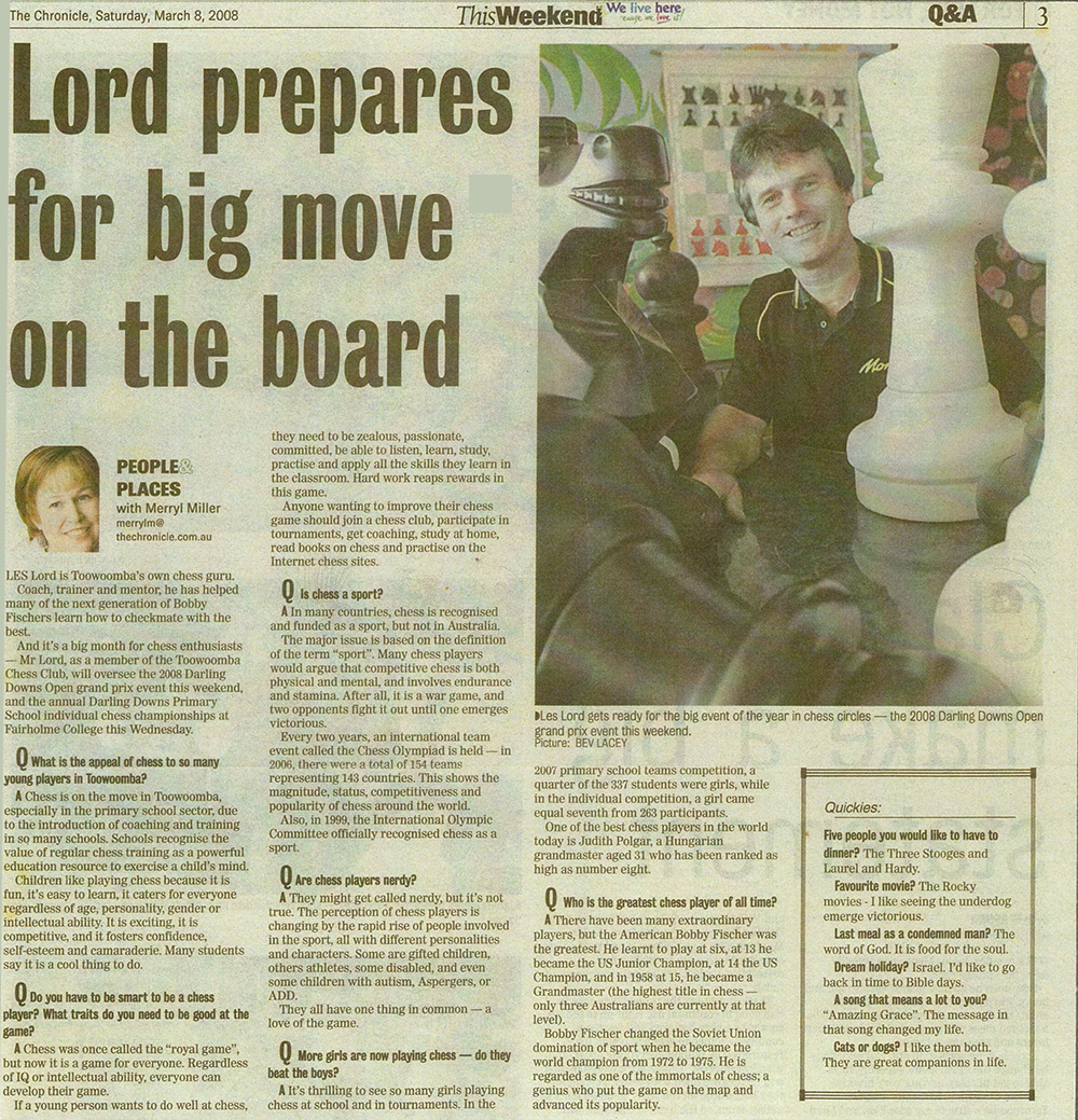 "I am privileged to have been coached by Les both as a student of Toowoomba Grammar and later as an adult. Les uses a mix of established chess theory with modern theory to achieve a well-balanced approach that has and still is competitive in the wider Australian chess community. Under the tutelage of Les I have played representative chess in New Zealand in 2006 and placed 11th in the 2014 Queensland Championships. Importantly, Les instils a mentality of hard work, respect and dedication to the game and opponents. It is for this reason that Les remains such a high-quality coach."